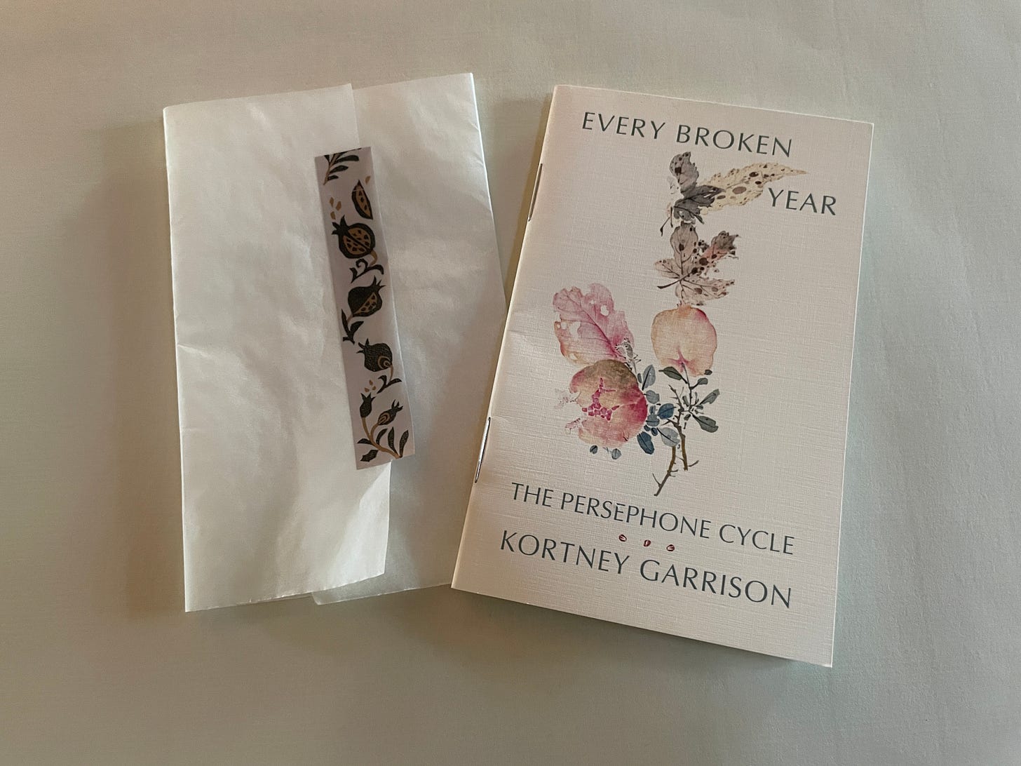 Without the Notes feature on Substack, I might never have discovered Kortney Garrison, a fine poet from the Pacific Northwest who publishes One Deep Drawer on Substack. Tiny Wren Lit has just published Kortney’s mini-chapbook of thirteen short poems, Every Broken Year: The Persephone Cycle, a retelling of the Greek myth from the standpoint of mother and daughter. Not only is the book a ravishing physical object—5.5 by 3.5 inches, printed on linen, with equally lovely packaging—the poems themselves are often breathtaking (“He was the river I wanted / to wade into,” from “Watching Hades in a Field”). Kortney Garrison is also the author of the chapbook Elemental, published by the fabulous Bottlecap Press.