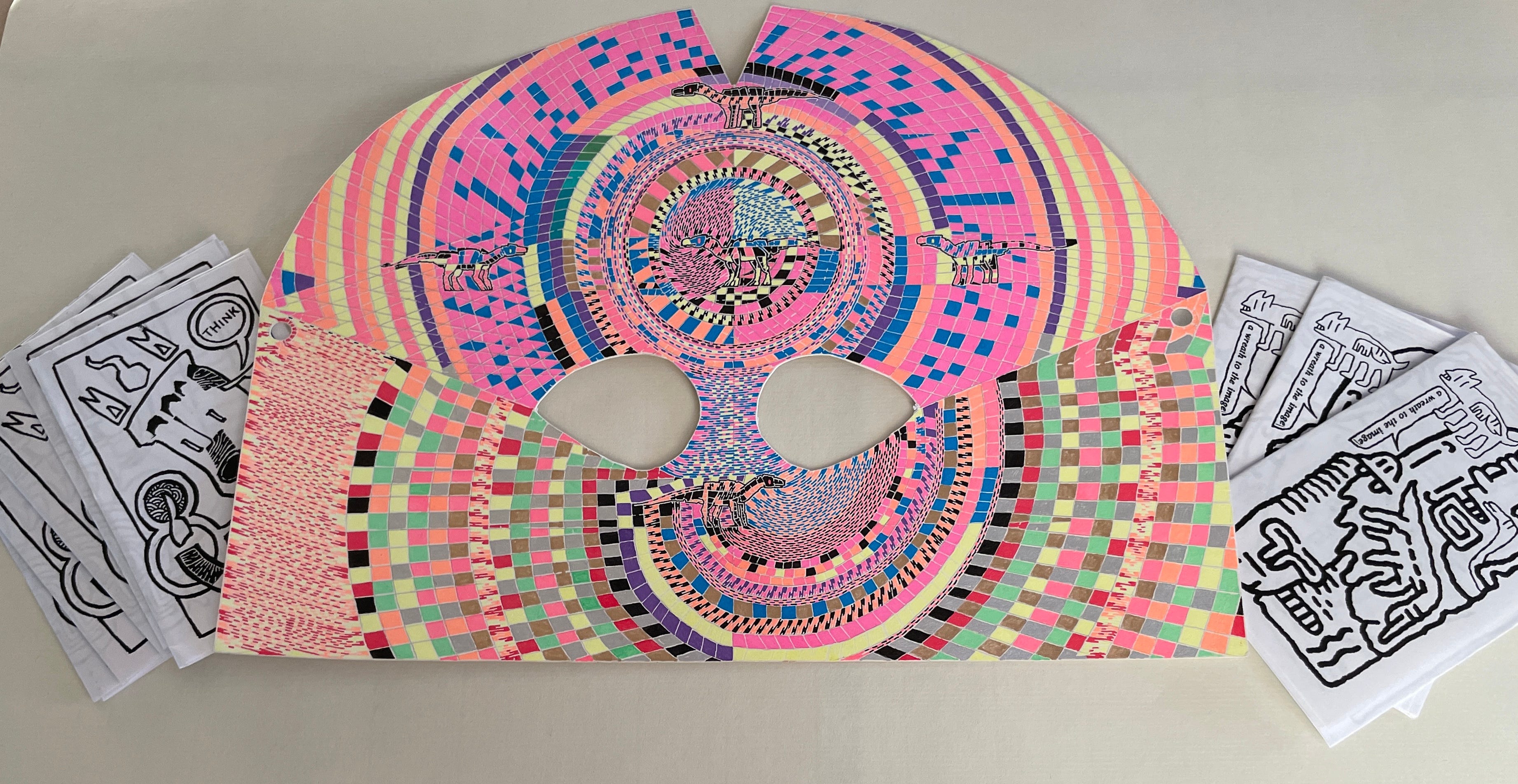 What do we know about the mysterious lowercase, low-profile West Coast writer, cartoonist, and visual artist known as d.w.? We don’t know his given name, but we do know that he goes by kidclampdown on his (private) Instagram account as well as at his website. Born and brought up in New Jersey, d.w. is a cofounder and editor of the comics and art anthology Irene (these bits of information come from the brief author bio that accompanies his 2017 Fantagraphics book Mountebank). For the past three years, d.w. has been publishing the uncommonly erudite and literate Substack newsletter One Could Argue, which he describes as “meditations on what I’m reading and watching.” In exchange for my two recent mini-chapbooks, d.w. sent me multiple copies of two tiny zines along with a mask that doubles as a trippy drawing on polar coordinate paper.