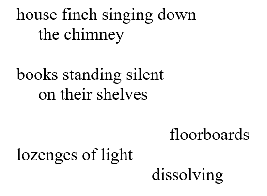 This made me think of the sparrow or house finch splashing around in a small stone birdbath off our patio the other morning, splashing, sitting, reflecting as one does in a bird bath, then splashing some more. It was lovely. Like this poem. Light, shadow, breeze.