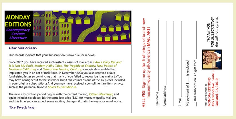 For the next twenty years, Monday Editions issued a potpourri of comics, zines, and mail art dispatched from Seattle, San Francisco, and Oakland to paying subscribers in the United States, Canada, the UK, and France. An annual $21 subscription entitled the buyer to six mailings of anything I felt like sending: a color-photocopied six-panel Little Bunny comic, a handmade microchapbook of short-shorts or prose poems, an invitation to participatory mail fraud, whatever.